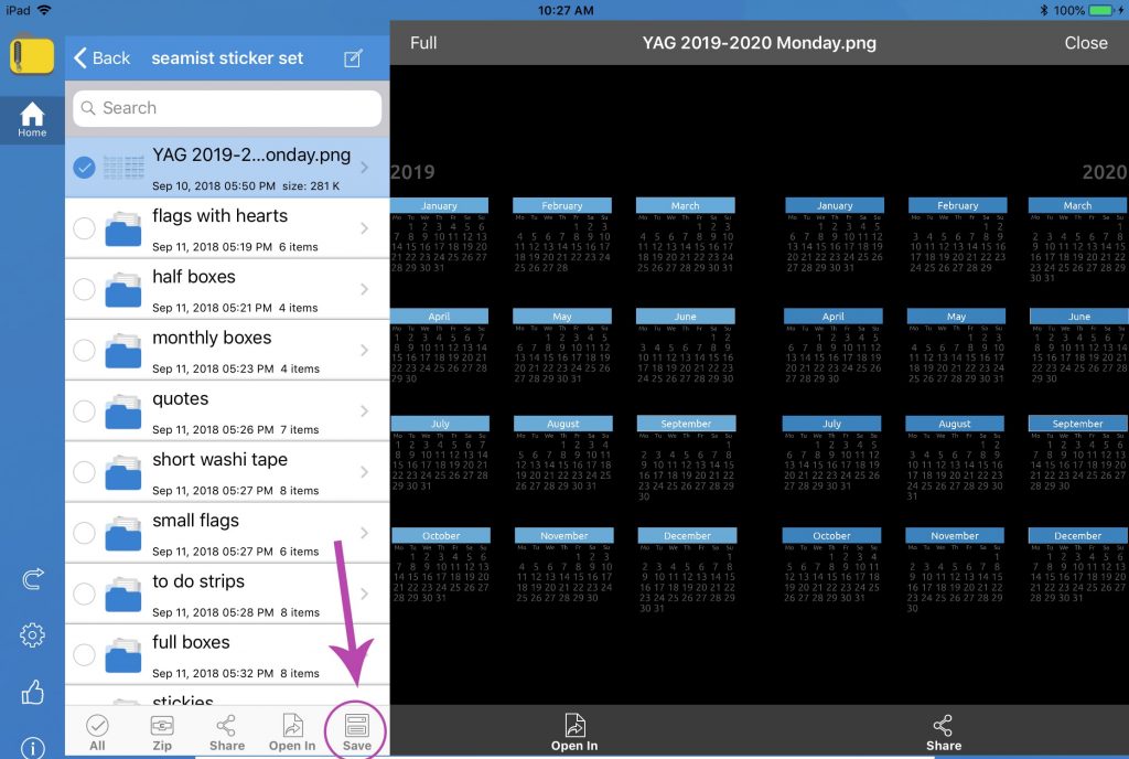 You will now see the zip file extracted as a folder. Tap on it and you will see a list of all the files. The stickers are grouped into sub folders, and your calendar file will be a single PNG. For example, if you are installing the 2019 – 2020 calendars with a Monday start, the file will be named YAG 2019-2020 Monday.png